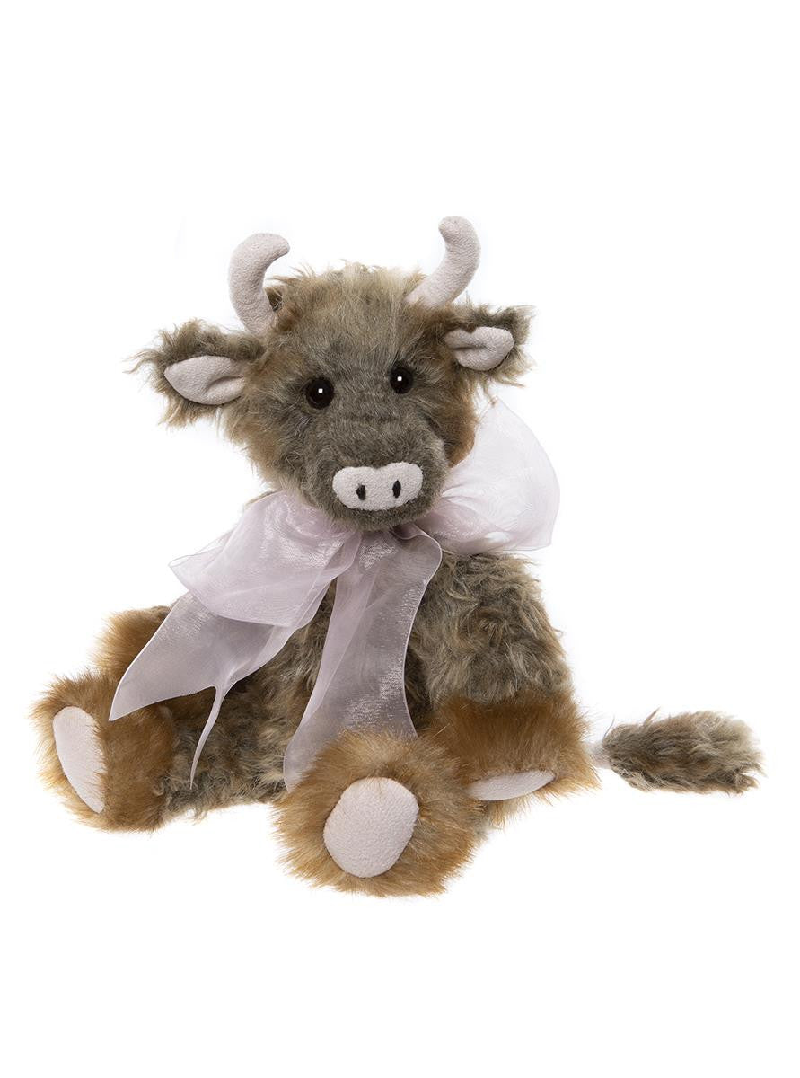 An udderly adorable cow made from super-soft plush. Her textured coat showcases various shades of brown, contrasting beautifully with her majestic white horns, inner ears, nose and hooves.